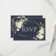 Modern and trendy, this wedding invitation RSVP design features a faux silver geometric embellished with watercolor white floral and eucalyptus greenery floral arrangements, over a modern navy blue texture. Meal choices are included, which are easily personalized. To remove meal choices, we have create a how-to video for you here: https://youtu.be/ZGpeldQgxoE Part of a matching wedding set. Copyright Elegant Invites. All rights reserved.
