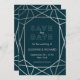 A modern and contemporary winter wedding "Save the Date", features a "faux foil" silver geometric pattern over a dark turquoise background. All your details are spelled in a beautiful modern typo.