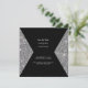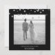 Silver Glitter and Black Envelope Style Square. Photo Wedding Save the Date. Back with Bride and Groom Photo last names as well as the text Wedding. Silver Glitter confetti. Website. Black and white filter applied to photo.