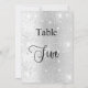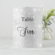 The table number is written with an elegant hand lettered style script. Black letters, a faux silver background with faux glitter dust, sparkles.