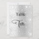 The table number is written with an elegant hand lettered style script. Black letters, a faux silver background with faux glitter dust, sparkles.