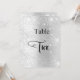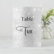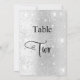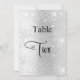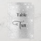 The table number is written with an elegant hand lettered style script.  Black letters, a faux silver background with faux glitter dust, sparkles.
