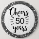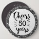 A silver glitter cheers to 50 years button which is great for a 50th birthday, 50th anniversary, etc. Please note there is not actual glitter on this product but a design effect.
