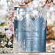 A modern, chic, and glamorous with silver glitter drips, and balloons on a blue metallic background.