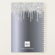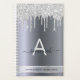 A faux silver looking background with elegant faux silver glitter drips, paint dripping look. Personalise and add a name, monogram letter and a title. The name is written in white with a large modern hand lettered style script with swashes. Grey and black coloured text. To keep the swashes only delete the sample name, leave the spaces or emoji's in front and after the name.