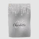 A faux silver metallic looking background decorated with faux silver glitter drips, paint dripping look. Personalise and add a name, your monogram initials. The name is written with a hand lettered style script.