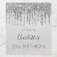For a girly and glamourous 21st (or any age) birthday party with the girls. A faux silver metallic looking background with faux glitter drips, paint dripping look. The text: The name is written in black with a modern hand lettered style script. Personalise and add a name, age 21 and a date. Date of birth or the date of the party.