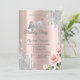 A modern, chic, and glamourous with silver glitter drips, roses on a rose gold background.