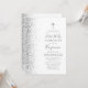 The left-hand edge of this elegant modern first communion invitation features a silver faux glitter border. A faux silver foil cross appears above the customisable text, which combines handwriting, copperplate and italic fonts in grey on a white background. The reverse side features a matching silver and white design.
