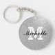Silver glitter name monogram keychain gift. Faux glittery glimmers and shiny sparkles print. Personalise with name initial letter. Classy Birthday gift idea or unique wedding favour for bridesmaids, guests etc. Glamourous monogrammed design with silvery background texture.