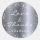 A faux silver looking background. Decorated with faux glitter dust. Personalise and add your first name. With the text: Love & Thanks.
