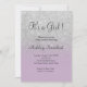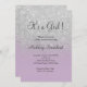 A modern, original and simple faux silver glitter ombre It's a girl baby shower invitation on a fully customisable pastel purple lavender colour background