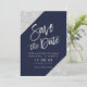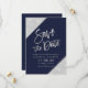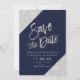 Silver typography on customisable navy blue silver glitter colour block, and faux silver geometric stripes chic save the date wedding , perfect for elegant, stylish wedding,