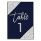 Silver glitter script navy blue table number