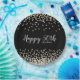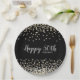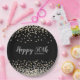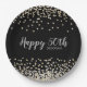 Add your own special touch to this elegant custom birthday party plate design featuring sparkly gold and silver confetti over a black background, modern script typography with the words "Happy 50th" and the birthday girl's name.