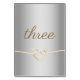Simple, minimalist, modern faux silver foil wedding table number with hand letter calligraphy script and gold rope heart.