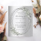 A faux silver looking background. An oval silver frame decorated with sage green greenery. Personalise and add your names, details. Black text.