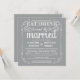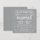 Eat, Drink, and be Married -- Elegant rustic style country wedding invitations -- Swirly, curly scrolls and old-fashion vintage typography in white lettering on silver pearl grey background. Add the bride and groom names and wedding info in this easy to use template. Fancy, fun and whimsical, retro hand-written chalk style calligraphy can be modified for your formal or semi-formal wedding theme. Casual but classy modern style is perfect for trendy contemporary weddings with a touch of romantic sophisticated charm for traditional couples. Please contact us for help with customisation if you need additional room for your wedding details. NOTE: Shown on standard A7 size invitation cards. Other sizes and styles available, along with matching postage stamps, coordinating bridal stationery, wedding packet accessories and shower favours.