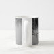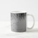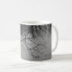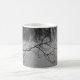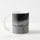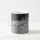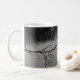 Mug with a black and white photo of a lake with tree branches and beautiful reflections.