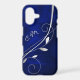 Here's an elegant phone case that features a modern silver leaf swirl against a deep royal blue gradient background. Your two letter monogram is at the left side in matching silver.