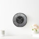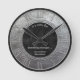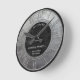 Wall clock featuring a stylish silver metallic design with black faux leather and roman numerals. Add your own (funny or other) texts and/or your logo.