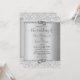 This elegant silver wedding design has a metallic background with damask and glitter frame on the top and bottom, with wedding rings as accents. “the wedding of” is written in modern script typography. On the back is the monogram of the new couple in a clean elegant script font.