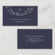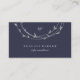 These stylish business cards feature a dark midnight blue background, with a faux silver circular wreath hanging down from the top of the card. Personalise with all of your information in light grey text.