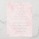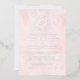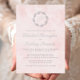 This elegant wedding invitation design features a script monogram initial encircled by a line art botanical wreath. The names appear in real silver foil script, with the rest of the text in classic serif font on a pale blush pink watercolor wash background. The watercolor wash is repeated on the back of the card.