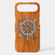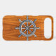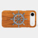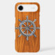A silver chrome like nautical wheel design on a teak wood veneer grain style background decor. A racy modern nautical gift.