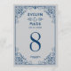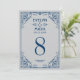 Intricate navy Art Deco scrollwork on a clean white background brings vintage elegance to this wedding table number card. The couple's names and wedding date are framed by ornate borders for a crisp, sophisticated monogram design. The couple's names, date, and table number are easy to personalise. Each table number must be individually personalised and added to the cart one at a time.
