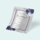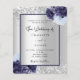 Faux silver looking background decorated with navy blue and light blue florals, flowers and faux silver glitter, sparkles. Personalise and add your names and wedding details. Black letters.