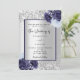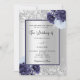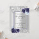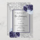 Faux silver looking background decorated with navy blue and light blue florals, flowers and faux silver confetti. Personalise and add your names and wedding details. Black letters.