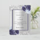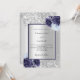Faux silver looking background decorated with navy blue and light blue florals, flowers and faux silver glitter, sparkles. Personalise and add your names and wedding details. Black letters.