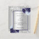 Faux silver looking background decorated with navy blue and light blue florals, flowers and faux silver glitter, sparkles. Personalise and add your names and wedding details. Black letters.
