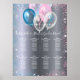 A faux silver looking background. Decorated with blue, pink and white balloons and blue and pink faux sparkles. Personalise and add the name(s) and your guests names. For 8 tables. White text.
