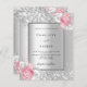 Faux silver looking background decorated with blush pink and white florals, flowers and faux silver glitter, sparkles. Personalise and add your names and wedding details. Black letters.