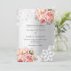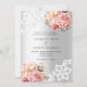 For an elegant and romantic wedding. A faux silver looking background decorated with pink and rose gold florals, roses and white lace. Personalise and add your names and details.