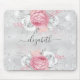 A feminine mouse pad for your office. A classic faux silver looking background. Decorated with pink and white roses, florals and faux silver glitter, sparkles. Personalise and add your name. The name is written with a modern hand lettered style script with swashes. To keep the swashes only delete the sample name, leave the spaces or emoji's in front and after the name.