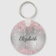 A faux silver metallic looking background decorated with pink faux glitter drips, paint dripping look. Personalize and add a name. The name is written with a modern hand letteredstyle script. Black colored letters.
