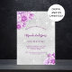 A faux silver looking background with faux silver sparkles and pink and violet flowers. Personalise and add a name and party details.