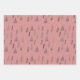 On this festive wrapping paper are silver polka dots, silver and pink snowflakes and silver drawn christmas trees on a pink backdrop