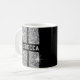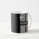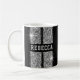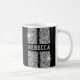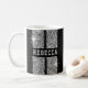 Fun custom mug with black and silver glitter racing stripes or car tire tracks and personalised name, perfect for an automobile racing enthusiast, mechanic loving tough chic woman, or girl who's into cars and racing sports, and new driver who just had their 16th birthday.