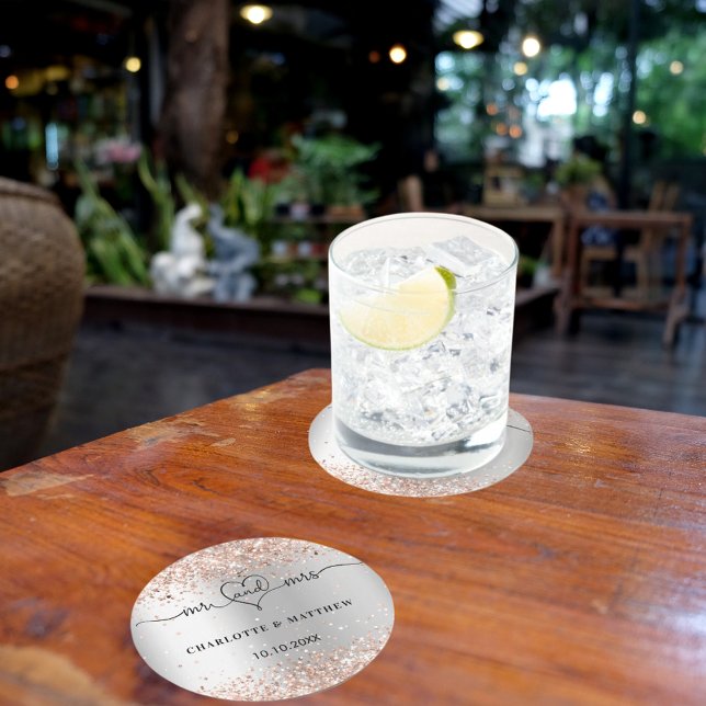Silver rose gold mr mrs heart script round paper coaster