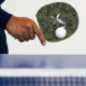 A silver metallic like Sagittarius zodiac symbol on a green woodland style digital camouflage design texture print background. A modern urban racy design for a great custom birthday gift idea.