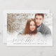 This elegant save the date features shimmering silver script in faux foil with a striped backer. Upload your own photo and customise the information to include your wedding details.