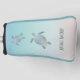 Silver sea turtles on a turquoise and sand/beige beach style background. Customise this beach golf head cover with your name.