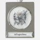 This charming holiday ornament showcases a silver sequin bow set against a radiant background adorned with dots and silver and bronze paint spatters. This coquette bow-inspired decoration will bring an element of sophistication to any Christmas tree. The message Congratulations makes it suitable for a wedding as well but can be changed if desired.