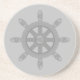 Silver ship wheel on light grey coaster