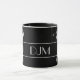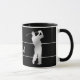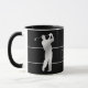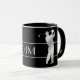 Images of a silver silhouette golfer taking a full swing are on two sides of this mug. Thin silver lines frame your family name, monogram, or other custom text in matching silver between the images. Everything is placed on a dramatic black background. Where ever you are, show everyone that you'd rather be golfing!