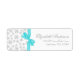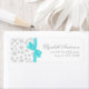 A winter wonderland themed return address label featuring a printed teal blue ribbon bow illustration and silver snowflakes. Designs are flat printed illustrations/graphics - NOT ACTUAL RIBBON.
